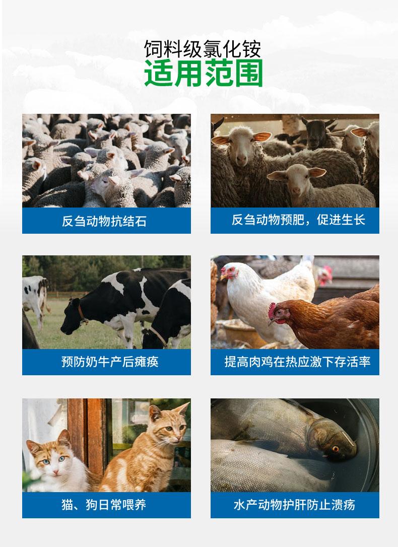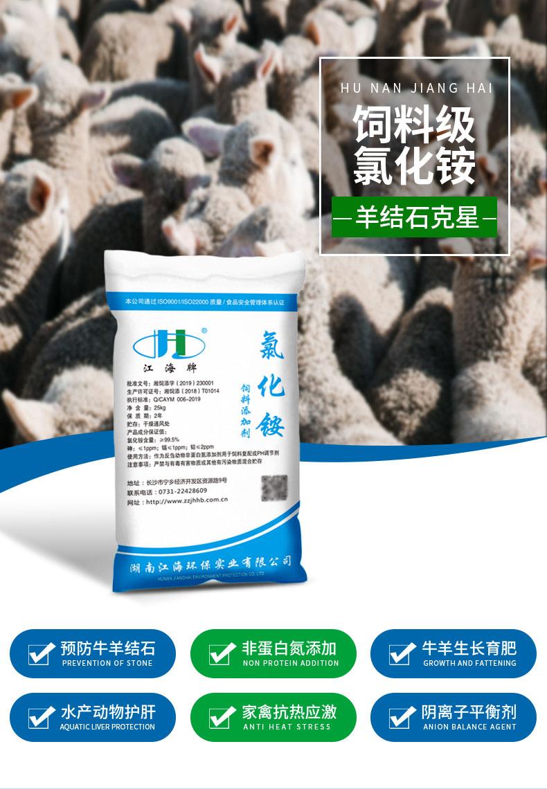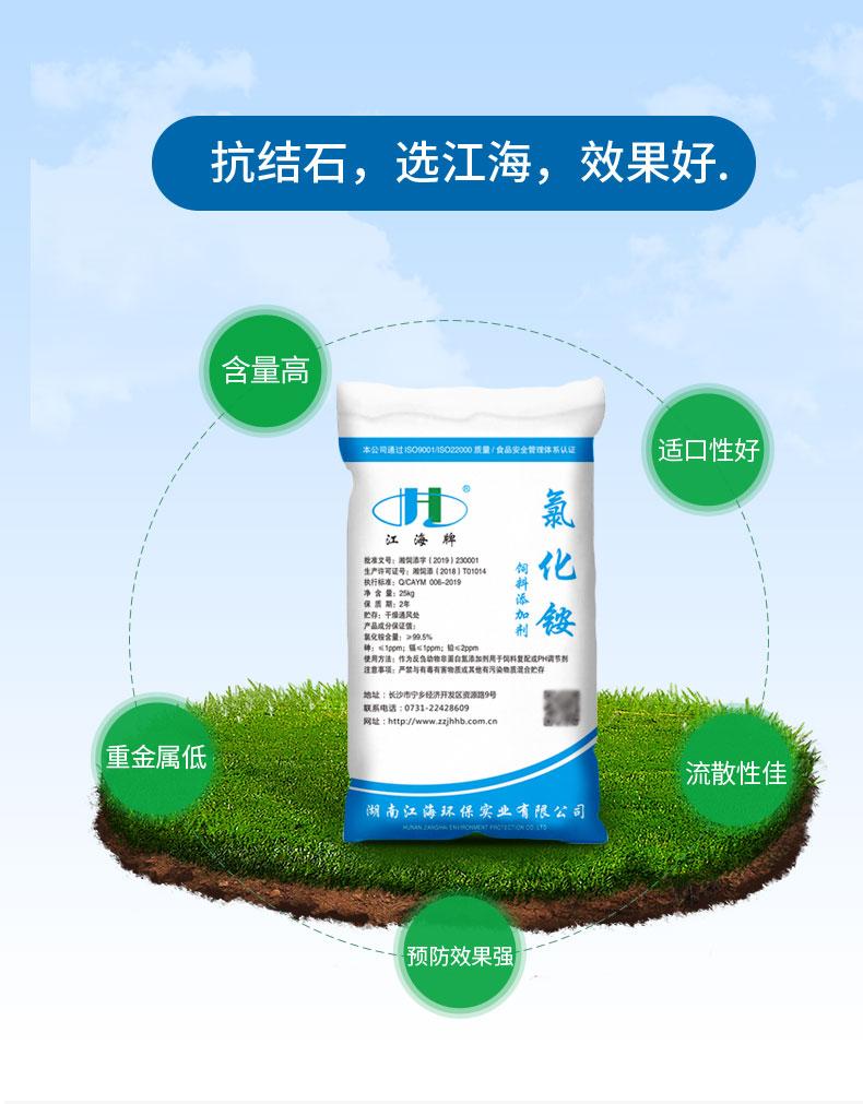 湖南江海環保實業公司生產的飼料級氯化銨是以農用或工業氯化銨為原料經過去雜、提純等工藝精制而成。產品純度高,重金屬離子含量低等特點。能作為非蛋白劑補充反芻動物蛋白質營養,也被廣泛作為反芻動物抗結石劑,奶牛產前的陰離子平衡劑,家禽抗熱應激藥物,應用前景十分廣泛。